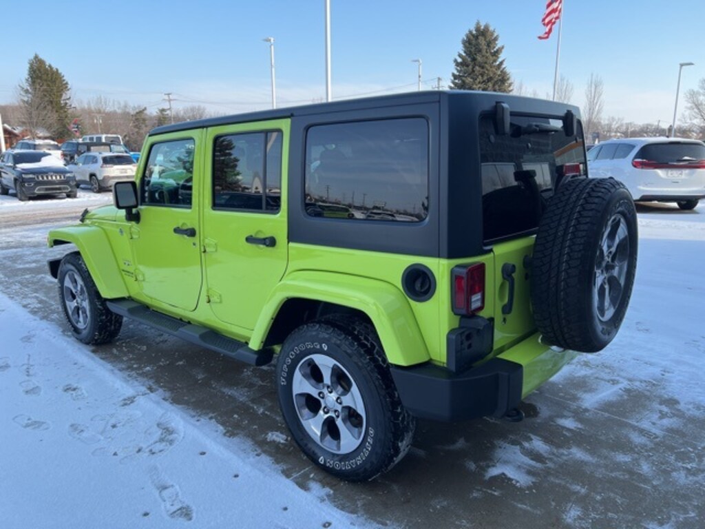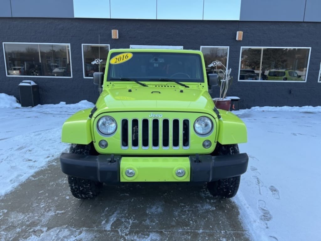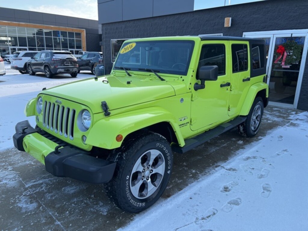 *NO NEED TO LEAVE YOUR HOME OR BUSINESS!! SZOTT DELIVERS!!!. Priced below KBB Fair Purchase Price! CARFAX One-Owner. Clean CARFAX. Odometer is 11251 miles below market average! 2016 Hypergreen Clearcoat Jeep Certified. 4WD Wrangler Unlimited Sahara 5-Speed Automatic With some available options like Connectivity Group (Leather Wrapped Steering Wheel, Remote USB Port, Tire Pressure Monitoring Display, Uconnect Voice Command w/Bluetooth, and Vehicle Information Center), Quick Order Package 24G (Body Color Appliques Front Bumper, Body Color Appliques Rear Bumper, and Body Color/Accent Color Grille), 18" x 7.5" Polished Satin Carbon Wheels, 3.21 Rear Axle Ratio, 4-Wheel Disc Brakes, 8 Speakers, ABS brakes, Air Conditioning, Air Conditioning w/Auto Temperature Control, Air Filtering, Alloy wheels, AM/FM radio: SiriusXM, Audio Jack Input for Mobile Devices, Auto-dimming Rear-View mirror, Black 3-Piece Hard Top, Brake assist, CD player, Cloth Seats w/Adjustable Head Restraints, Compass, Driver door bin, Driver vanity mirror, Dual front impact airbags, Electronic Stability Control, Freedom Panel Storage Bag, Front anti-roll bar, Front Bucket Seats, Front Center Armrest w/Storage, Front fog lights, Front reading lights, Fully automatic headlights, Heated door mirrors, Heavy Duty Suspension w/Gas Shocks, Humidity Sensor, Illuminated entry, Integrated roll-over protection, Leather steering wheel, Low tire pressure warning, Manufacturer's Statement of Origin, MOPAR Slush Mats, Occupant sensing airbag, Outside temperature display, Panic alarm, Passenger door bin, Passenger vanity mirror, Power door mirrors, Power steering, Power windows, Radio data system, Radio: 130, Rear anti-roll bar, Rear Window Defroster, Rear Window Wiper/Washer, Remote keyless entry, Remote Start System, Security system, Speed control, Split folding rear seat, Steering wheel mounted audio controls, Sunrider Soft Top, Tachometer, Tilt steering wheel, Traction control, Trip computer, and Variably intermittent wipers.